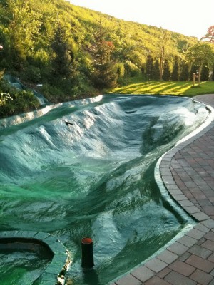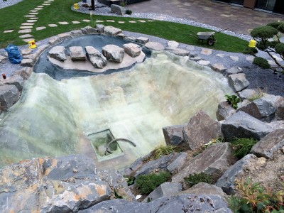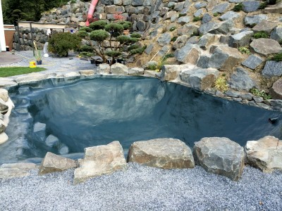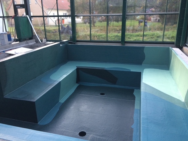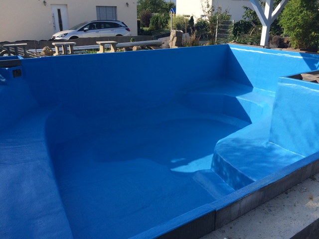Wir erstellen GFK-Teiche aus mindestens 2 Lagen Glasseidenmatte (450Gr./m2), bei gemauerten bzw. betonierten Böden/Wänden. Der Teich wird zum Abschluß noch mit einem farbigen Topcoat versiegelt. Auf Wunsch auch mit einem Gel-Coat/Top-Coat. (Es stehen verschiedene Farben zur Auswahl. (dunkel grün, hellgrau, mittelgrau, schwarz, blau) Je nach Anzahl der Schichten erhalten Sie so eine Wandstärke von mehreren Millimetern, die absolut witterungsbeständig sind und Jahrzehnte halten. Sie können diese Arbeiten gerne von uns ausführen lassen.
